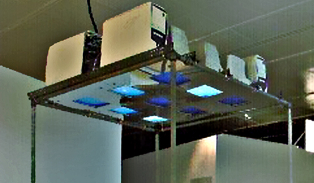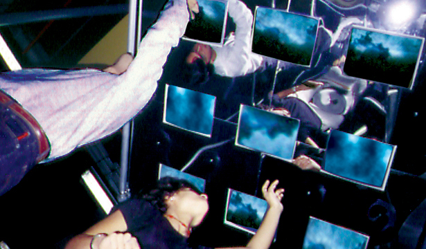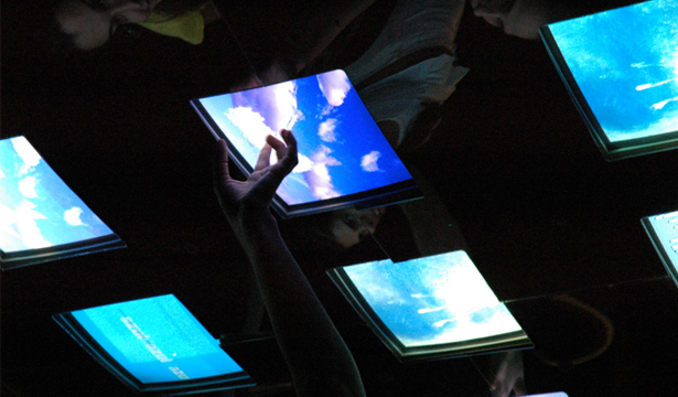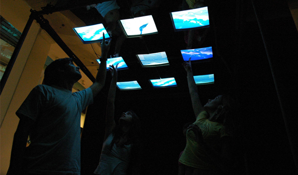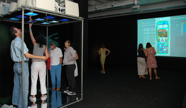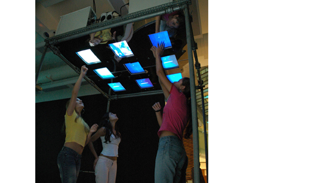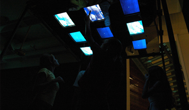 Os computadores estavam dispostos sobre as cabeças dos participantes e uma animação interativa possibilitava diferentes caminhos de percepção/navegação.