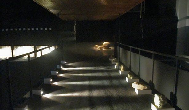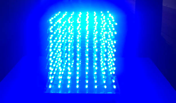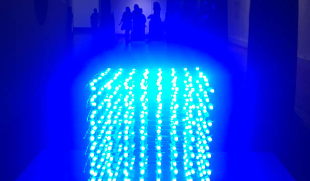 Na galeria, uma pedra, dentro de um cubo de Leds azuis (8X8X8), que responde às intervenções virtuais, variando com a intensidade e freqüência da luz, de acordo com as escolhas e nominações .